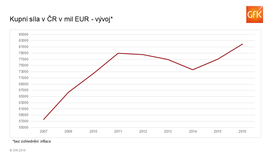Po tříleté stagnační fázi, která proběhla v letech 2011–2013, kupní síla obyvatel České republiky opět kontinuálně roste a v současné době je její hodnota nejvyšší za posledních deset let. V letošním roce dosahují disponibilní příjmy v České republice 82 miliard eur. Na vyspělé evropské země to však stále nestačí.