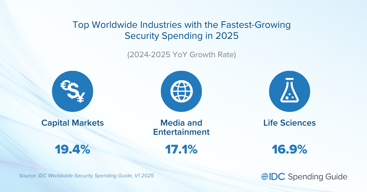 V roce 2025 budou na celosvětové úrovni na bezpečnost nejvíce vynakládat bankovnictví, federální/úřední státní správy, telekomunikační firmy, organizace stojící za kapitálovými trhy a poskytovatelé zdravotní péče. Nejrychleji porostou organizace stojící za kapitálovými trhy (19,4 %), subjekty ze sektoru médií a zábavy (17,1 %) a instituce ze segmentu zdravotních/životních věd (16,9 %).