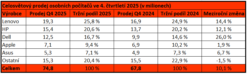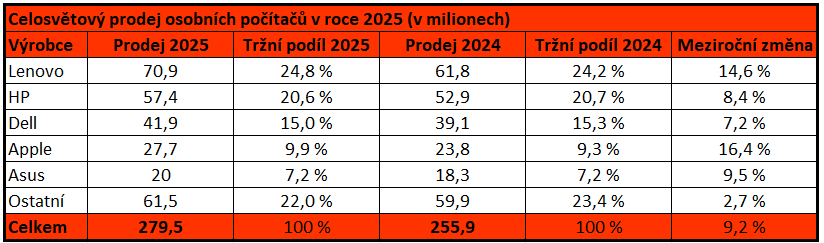 Na druhém místě se usadila společnost HP, která ve čtvrtém čtvrtletí roku 2025 dodala 15,4 milionu osobních počítačů a zaznamenala růst jak v jednotlivých čtvrtletích, tak za celý rok.