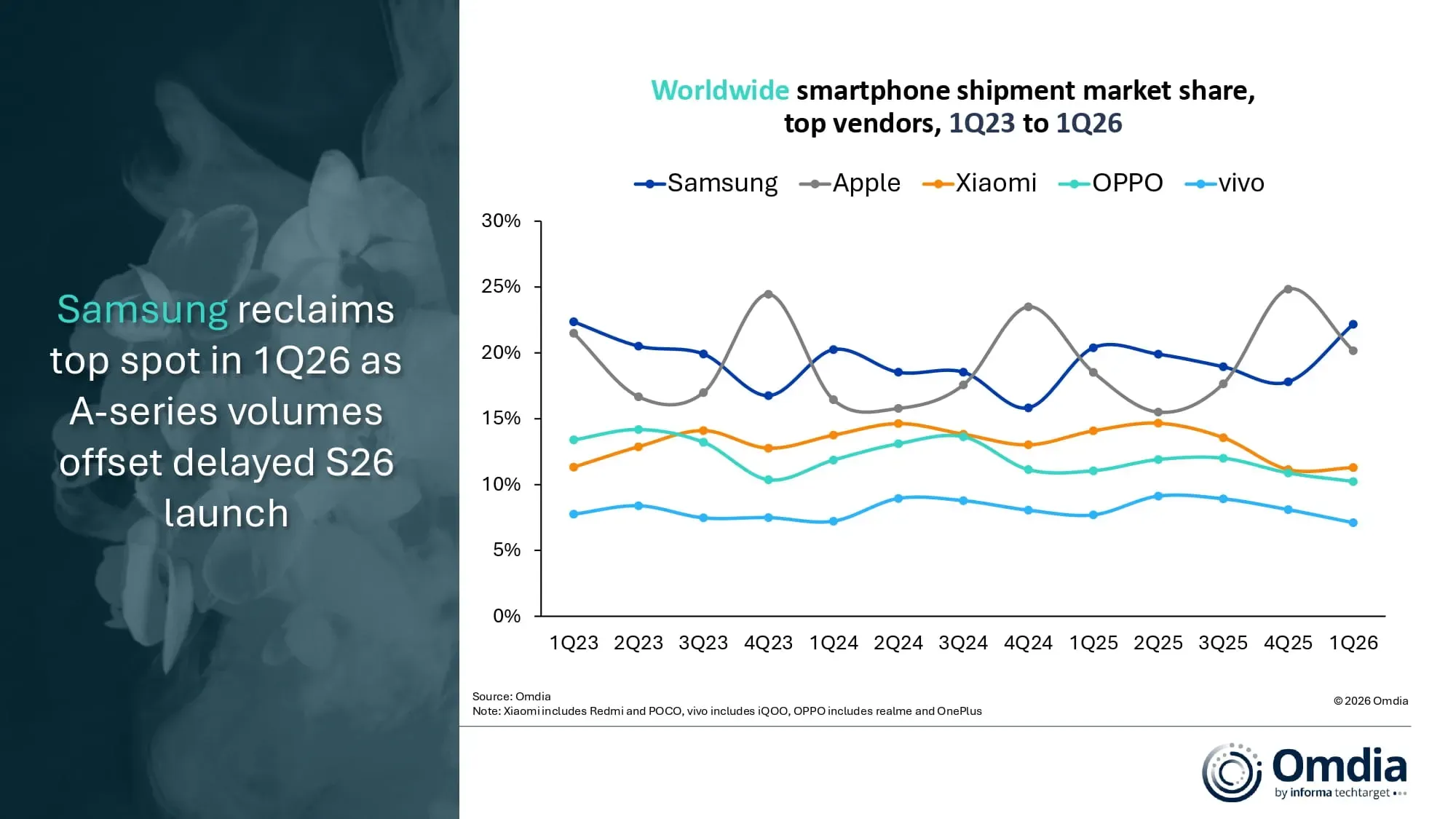 Společnost Samsung si v prvním čtvrtletí letošního roku znovu vybojovala vedoucí pozici na žebříčku největších dodavatelů, a to díky stabilní poptávce po vlajkových modelech a silným předobjednávkám řady Galaxy S26 – které celosvětově vzrostly o více než deset procent ve srovnání s řadou Galaxy S25 – a to i přes pozdější uvedení na trh, které ovlivnilo cyklus obnovy zařízení zejména ve střední třídě.