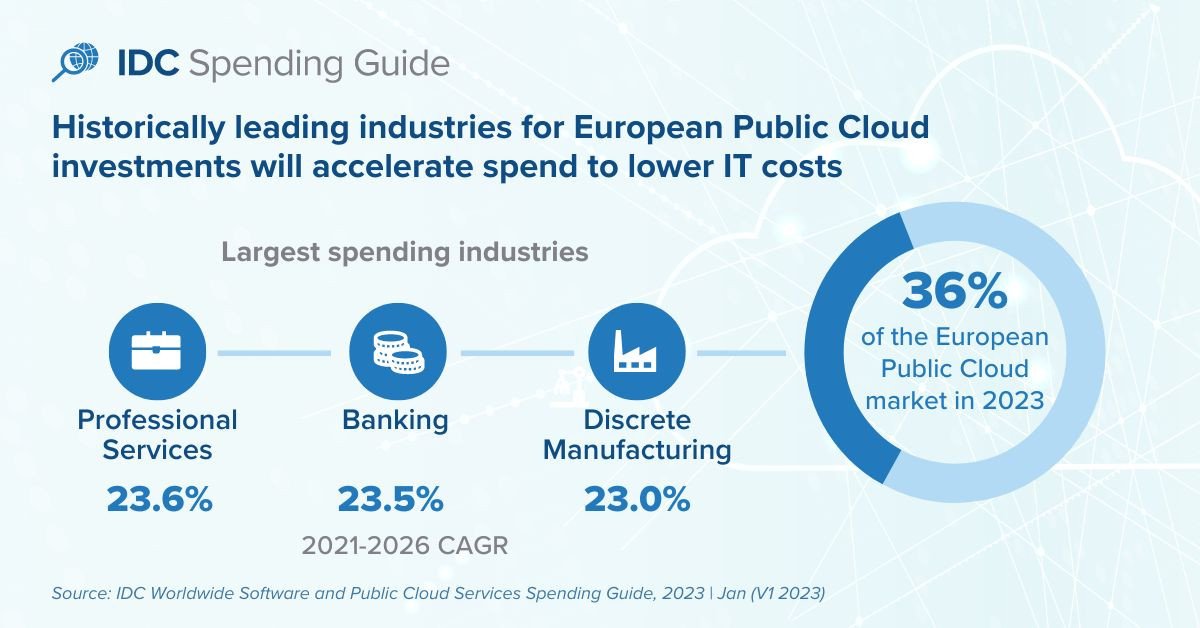Poskytovatelé profesionálních služeb, bankovnictví a diskrétní výroba jsou odvětvími s nejvyššími výdaji ve veřejných cloudových službách. Celkem se na nich budou letos podílet z 36 %. Situace v Evropě však zůstává i nadále napjatá.