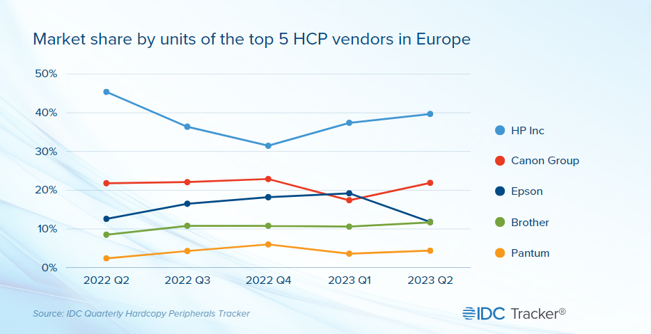Pět největších dodavatelů z hlediska počtu prodaných zařízení na evropském trhu zůstalo oproti předchozímu roku nezměněno: HP Inc., Canon, Epson, Brother a Pantum. Brother vykázal 3,2% meziroční růst (v objemu), a to díky lepší dostupnosti produktů, která umožnila důsledně doplňovat zásoby v prodejním kanálu.