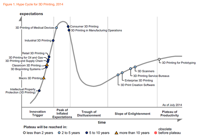 „Do každodenního života běžných lidí se 3D tisk dostane za pět až deset let,“ uvedl Pete Basiliere, viceprezident výzkumu ve společnosti Gartner. „Vývojem a výrobou 3D tiskáren se celosvětově v současné době zabývá zhruba 40 výrobců a 200 start-upů. Právě start-upy se zaměřují hlavně na běžné uživatele a nabízejí zařízení v ceně několika set dolarů. Pro běžné uživatele je však cena stále příliš vysoká, a to i navzdory rostoucímu povědomí o technologii 3D tisku a velkému zájmu médií o ni.“