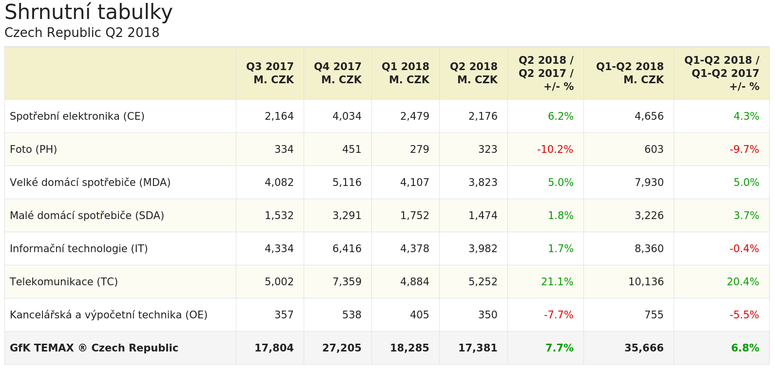 Trh s technickým spotřebním zbožím zaznamenal v České republice dle společnosti GfK ve druhém čtvrtletí roku 2018 meziroční nárůst na úrovni téměř osm procent. Na pozitivním vývoji se podílely zejména sektory telekomunikací, velkých domácích spotřebičů a spotřební elektroniky.