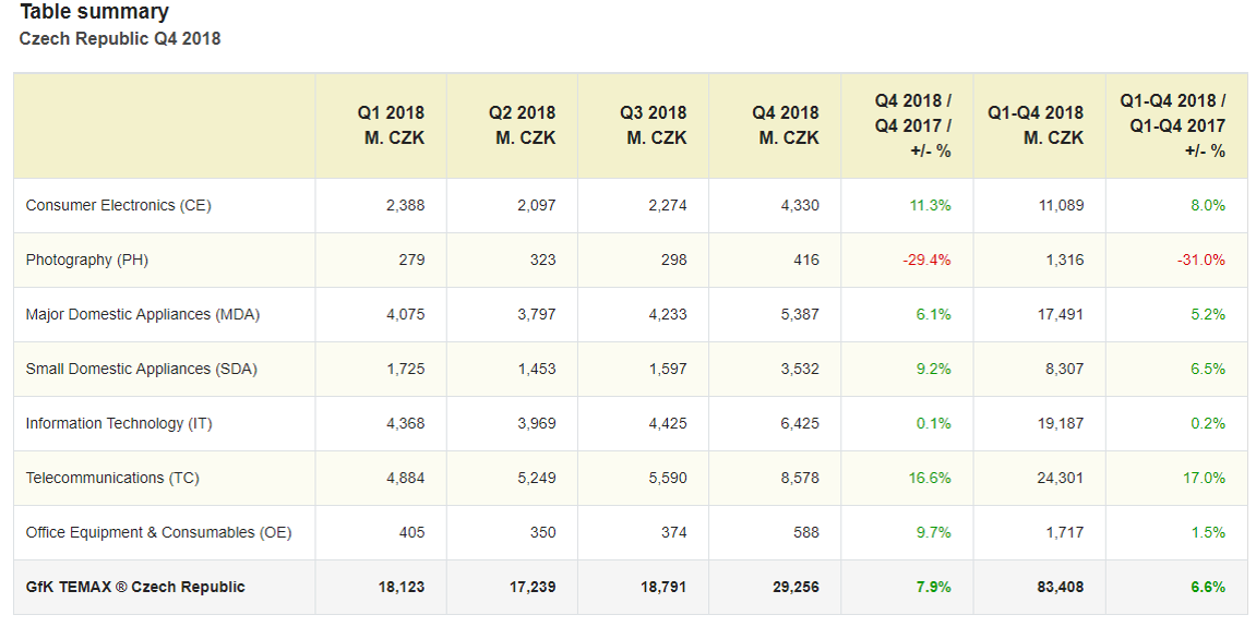 V ČR v sektoru spotřební elektroniky pokračuje růst poptávky po televizorech a set-top-boxech v důsledku přechodu na vysílání ve standardu DVB-T2. Dvouciferný meziroční nárůst hodnoty prodejů zaznamenaly také přenosné dokovací reproduktory s Bluetooth připojením a bezdrátová sluchátka. U sluchátek se zájem spotřebitelů dále posouvá k prémiovým segmentům.