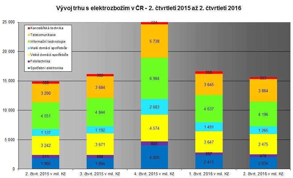 Trh s technickým spotřebním zbožím zaznamenal v ČR za druhé čtvrtletí 2,5% meziroční nárůst. Pozitivní vývoj zaznamenaly sektory spotřební elektroniky, velkých a malých domácích spotřebičů a již tradičně také telekomunikace. Slovenský trh ve stejném období zaznamenal 12% nárůst. Trh táhly všechny sektory kromě fota.