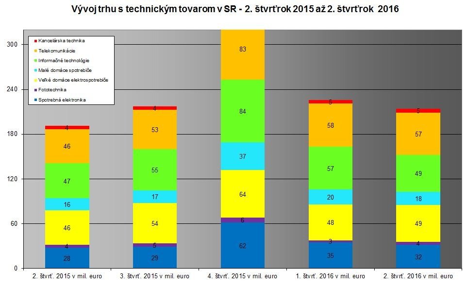V druhom kvartáli 2016 zaznamenal sektor spotrebnej elektroniky na Slovensku rast na úrovni 14,9 % v porovnaní s rovnakým obdobím roku 2015. Predaje televízorov v 2. kvartáli 2016 oproti 2. kvartálu 2015 významne vzrástli v hodnotovom vyjadrení a to hlavne vďaka väčšej orientácii zákazníkov na uhlopriečky 40 palcov a viac, ktoré medziročne vzrástli o takmer 22 %. Silný rast bol zaznamenaný aj v segmente set-top-boxov a to hlavne vďaka rastúcemu záujmu o funkciu DVB-S2, ktorý vyvolal plánovaný prechod na druhú generáciu štandardu pre satelitné vysielanie v roku 2016.
