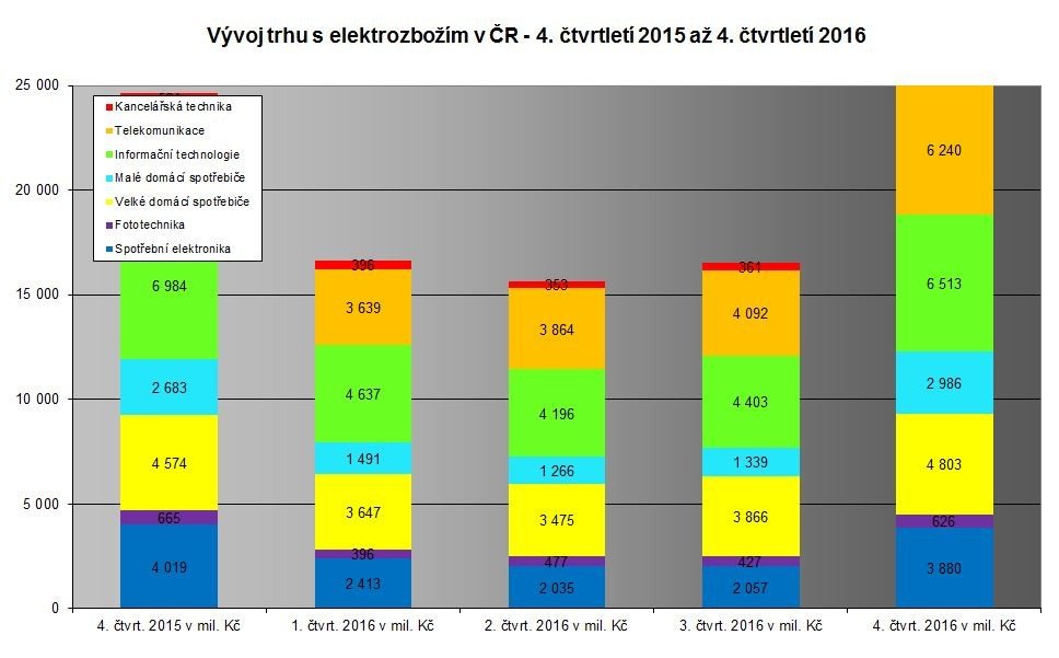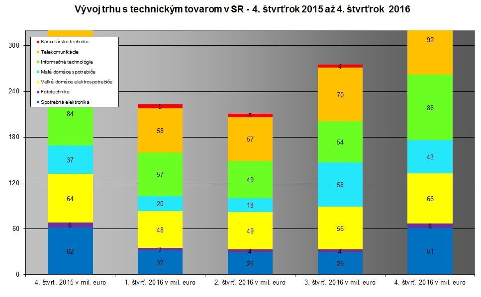 Trh s technickým spotřebním zbožím zaznamenal v České republice za poslední čtvrtletí roku 2016 ve srovnání se stejným obdobím předchozího roku téměř 4% nárůst. Růst byl tažen zejména telekomunikacemi, ale také velkými a malými domácími spotřebiči. Slovenský trh technického spotřebního zboží zaznamenal ve stejném období 7% nárůst.