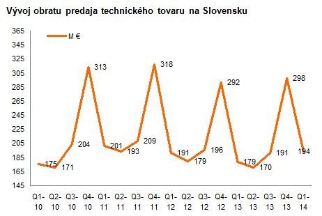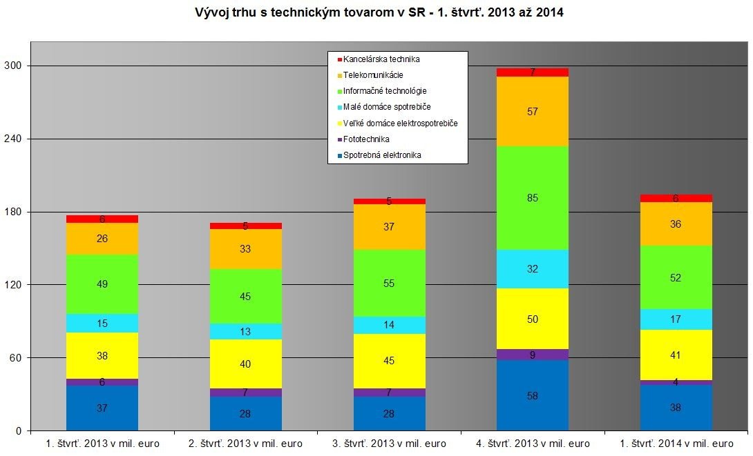 Prvý kvartál roku 2014 sa na Slovensku po dlhšom období niesol v znamení rastu. Medziročne to bolo o niečo viac ako 2 % z hľadiska hodnoty. Významnú úlohu na trhu spotrebnej elektroniky hrajú televízie, ktoré pomerne značne narástli, najmä vďaka februárovým zimným olympijským hrám. K pozitívnemu trendu však taktiež prispel zvýšený dopyt spotrebiteľov po televízoroch s uhlopriečkou 40 palcov a viac. Tradičné skupiny ako napr. audio systémy, video prehrávače, prípadne MP3/MP4 prehrávače pokračujú v zotrvávajúcom poklese.