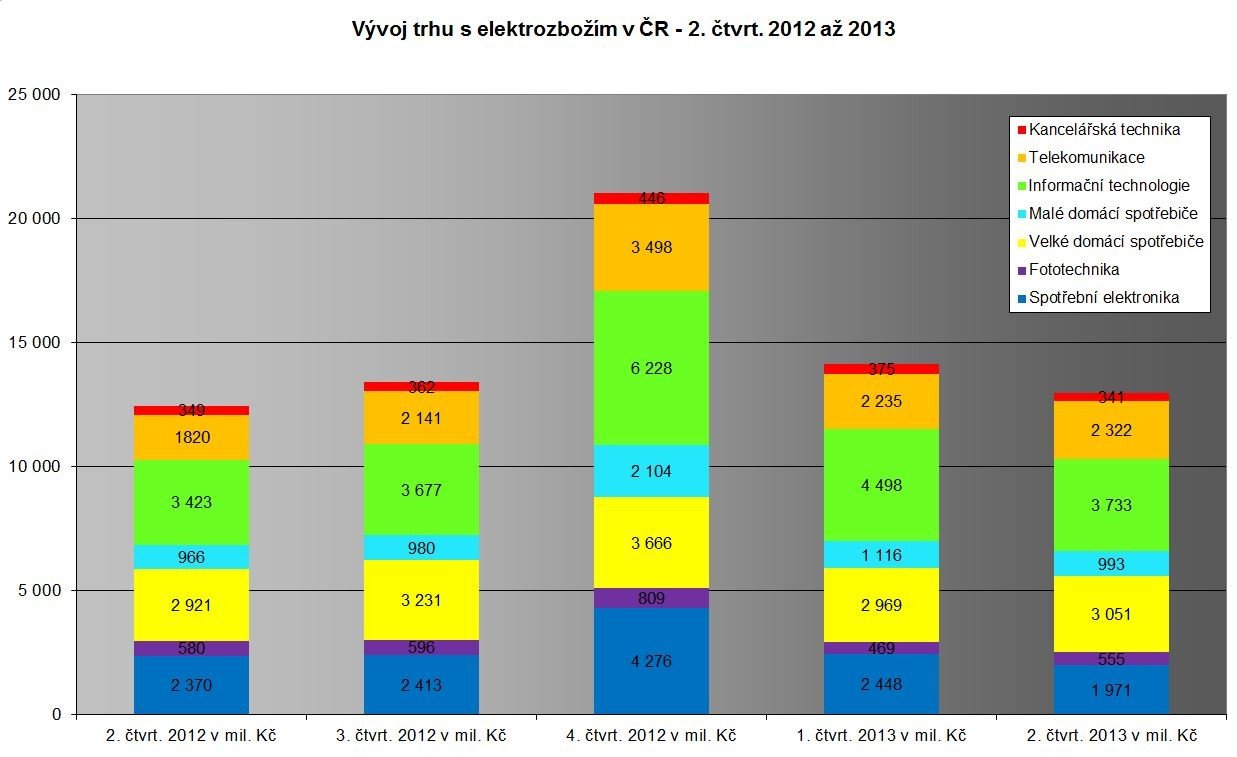 Ani ve druhém čtvrtletí roku 2013 se v České republice v sektoru spotřební elektroniky nezměnil negativní trend z předcházejících čtvrtletí a trh meziročně propadl o více než 15 %. V záporných číslech zůstává i klíčová část trhu, televizory. Pozitivně se však vyvíjejí přístroje s velkou úhlopříčkou, také i díky pokročilým funkcím (Smart TV, 3D). Poklesy jsou však i u většiny dalších kategorií, jako například set top boxů, audiosystémů nebo DVD přehrávačů.