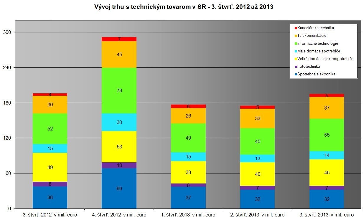Aj v treťom štvrťroku v SR ostal sektor spotrebnej elektroniky v záporných číslach a v porovnaní s rovnakým obdobím minulého roku klesol o takmer 17 % z hľadiska hodnoty. Celkový vývoj sektoru výrazne ovplyvňujú televízory, ktoré aj v tomto období zaznamenali medziročný pokles. Darí sa však prístrojom s veľkou uhlopriečkou a pokročilými funkciami – Smart TV a 3D. Poklesy však registrovali aj ďalšie kategórie – napr. audiosystémy, DVD prehrávače či set top boxy.