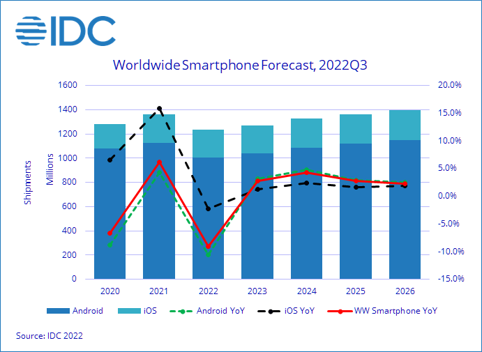 „Trh s chytrými telefony bude přinejmenším během první poloviny roku 2023 stále čelit značným potížím a komplikacím. Věříme však, že zhruba v polovině roku dojde ke zlepšení a ve druhé polovině roku bychom již mohli sledovat postupné obnovování,“ uvedl manažer IDC Ryan Reith. „Rostoucí výrobní náklady jsou pro výrobce chytrých telefonů i další elektroniky problémem, přesto však věříme, že poptávka během roku 2023 a později opět postupně poroste. Zejména v hospodářský rozvinutých regionech se výrobci a operátoři snaží rostoucí náklady kompenzovat agresivnějším marketingem, atraktivnějšími nabídkami na výměnu zařízení a vylepšenými možnostmi financování. To navzdory značné ekonomické nejistotě podpořilo růst v high-endové části trhu.“