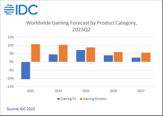 Zatímco poptávka po běžných osobních počítačích a monitorech zpomalovala, poptávka po herních počítačích a monitorech stále vykazovala určitou odolnost. Společnost IDC předpovídá, že celosvětové dodávky herních monitorů v roce 2023 meziročně vzrostou o 10,8 %, zatímco u herních PC se očekává pokles o 10,5 %.