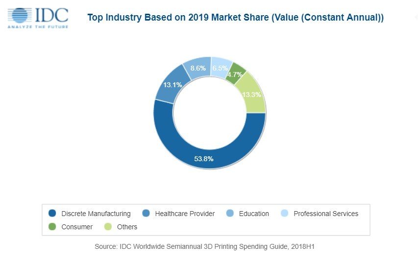 Hlavním uplatněním 3D tiskáren letos bude kusová (diskrétní) zakázková výroba, která v letech 2018 – 2022 vygeneruje více než poloviny celosvětových tržeb mířících do tohoto segmentu. Mezi další pro 3D tisk atraktivní segmenty patří zdravotnictví (1,8 miliardy USD), vzdělávání (1,2 miliardy USD) a profesionální služby (898 milionů USD). Spotřebitelé (domácnosti) přispějí k celosvětovým tržbám jen necelými pěti procenty (647 milionů USD). Do roku 2022 by měla na páté pozici spotřebitele vystřídat sériová výroba. Nejrychlejší růst se předpokládá zdravotnictví (29,8 %) a dopravě (28,3 %).