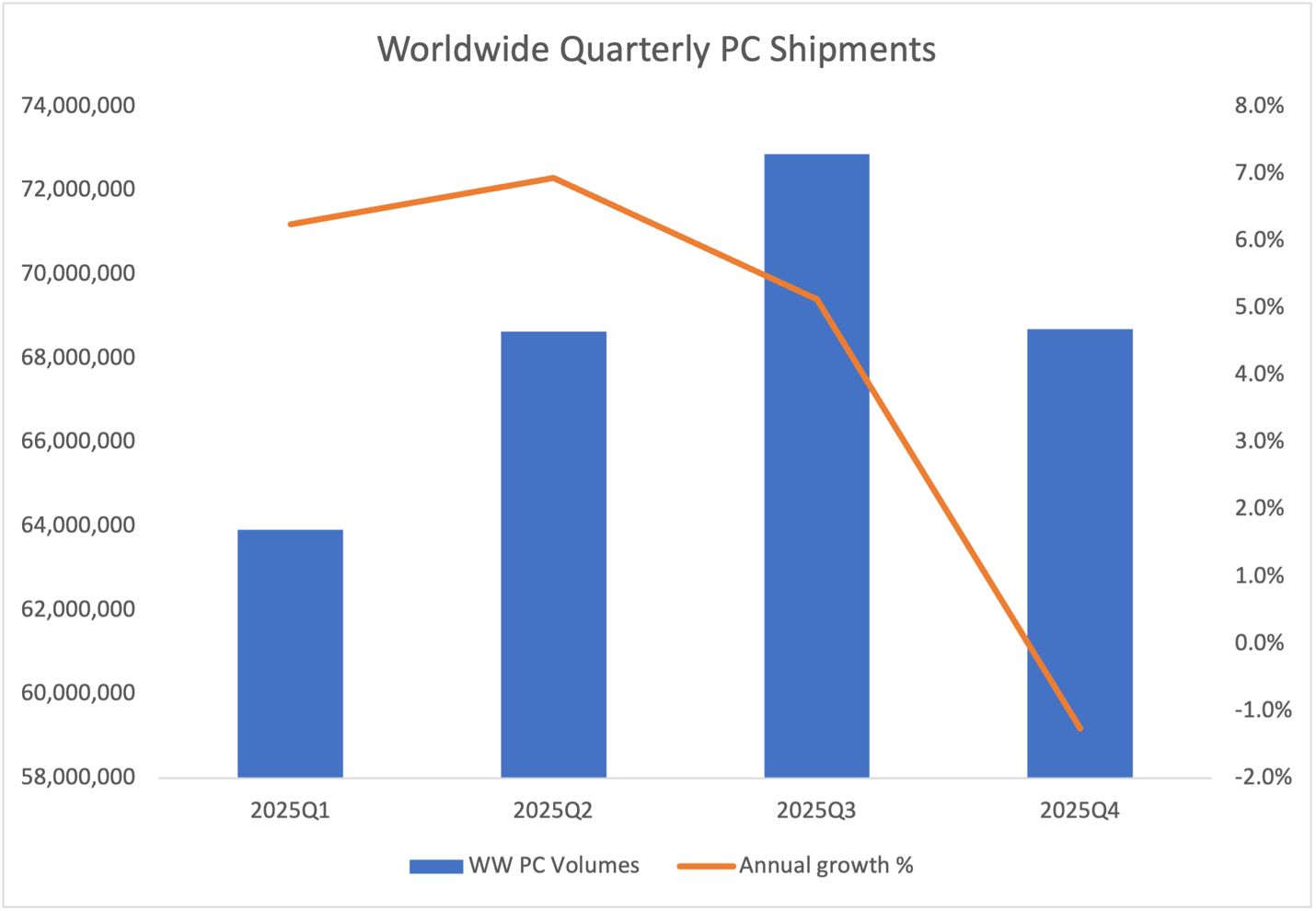 Pro rok 2026 se prozatím počítá s mírným poklesem, ke kterému by mělo dojít v důsledku stabilizace trhu po dokončení přechodu na systém Windows 11 i v důsledku srovnávání s relativně silnými prodeji v roce 2025.