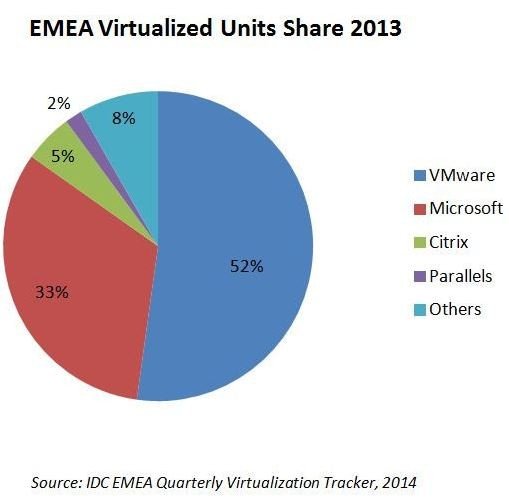 Rovných 33 % serverů dodaných v regionu EMEA ve 4. čtvrtletí 2013 mělo virtualizovanou podobu. Šlo o více než 200 000 produktů, což je o 9,6 % více, než ve stejném období roku 2012. Prodej virtualizačních licencí meziročně vzrostl o 12 % na 282 300. Tržby z prodeje virtualizačního softwaru vzrostly ve 4. čtvrtletí 2013 o 14,2 % na 456,3 milionu dolarů. Dodávky fyzických serverů přitom byly téměř stabilní, meziročně poklesly o 0,3 % a činily 606 400 kusů.
