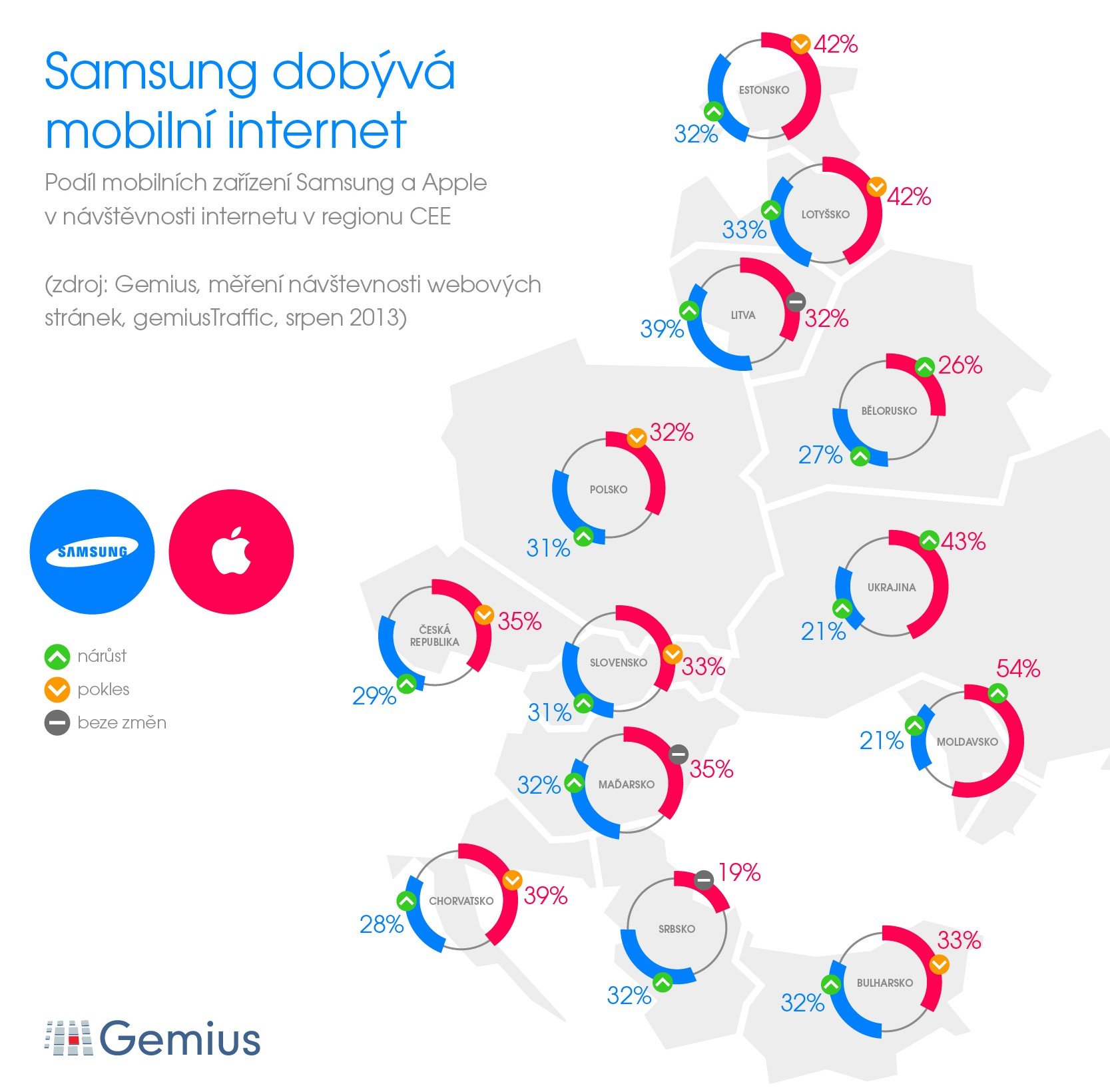 Na všech analyzovaných trzích zaznamenal Samsung výrazný nárůst mobilní návštěvnosti. V Litvě, Bělorusku a Srbsku již nyní zaznamenala korejská značka nejvíce mobilních zobrazení webových stránek (kolem 40 %), na dalších trzích se jeho vítězství nad značkou Apple očekává. V České republice se počet zobrazení stránek tvořených mobilními zařízeními od značky Samsung zvýšil v průběhu posledních dvanácti měsíců o pět procentních bodů a nyní tvoří již téměř 29 % všech mobilních zobrazení stránek. Nicméně Apple je u nás stále nejpoužívanější značkou mobilních zařízení, ze které pochází asi 35 % mobilních zobrazení stránek. Apple vede také na dalších trzích, například v Estonsku, Lotyšsku či Chorvatsku, ale jeho podíl postupně klesá.