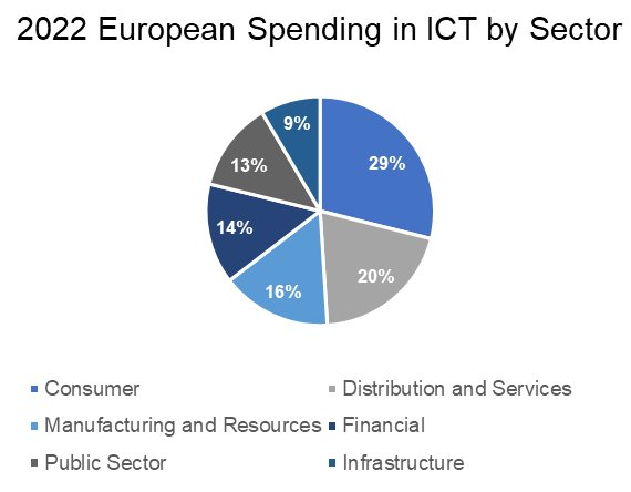 Mezi největší investory do ICT budou v roce 2022 patřit spotřebitelé, bankovní instituce i výrobní sektor, kteří se postarají asi o 46 % veškerých letošních výdajů. Evropa je poznamenána problémy s logistikou a výrobními řetězci, z nichž řada úzce souvisí s válkou na Ukrajině.