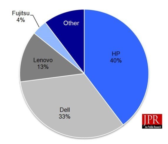 Tržní podíl „velké čtyřky“ se během prvního čtvrtletí 2014 změnil jen málo. Trhu nadále dominovaly dvě firmy – HP s tržním podílem 39,7 % a Dell s tržním podílem 33,3 %. Na dalších dvou pozicích se pak umístily Lenovo (12,9 %) a Fujitsu (3,9 %). O zbývajících zhruba 10 % se podělili menší výrobci a systémoví integrátoři.