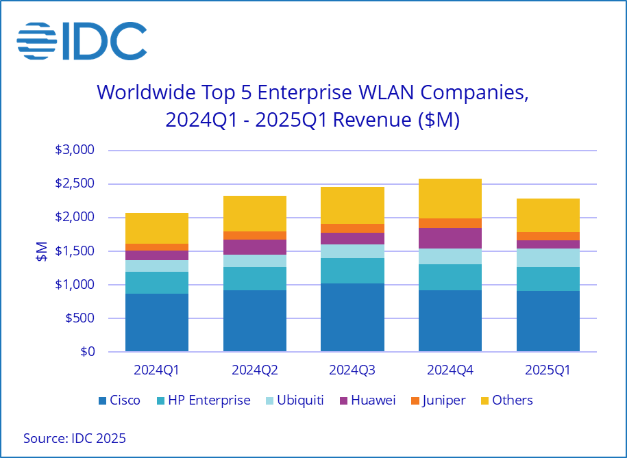 Celosvětový trh s bezdrátovými sítěmi (WLAN) pro podniky podle IDC v prvním čtvrtletí roku 2025 meziročně vzrostl o 10,6 % a dosáhl hodnoty 2,3 miliardy dolarů.