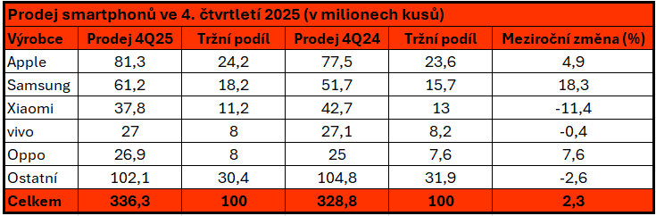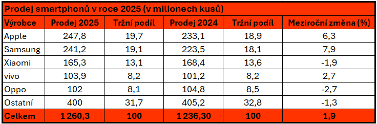Celosvětový trh se smartphony podle IDC vzrostl ve čtvrtém čtvrtletí roku 2025 o 2,3 %. Navzdory počínající krizi způsobené nedostatkem paměťových čipů trh rostl díky zájmu o prémiové produkty, kde se dařilo zejména Applu a Samsungu. Část zákazníků se rozhodla pro pořízení nového telefonu také kvůli obavám z růstu cen. Za celý rok 2025 se pak prodalo 1,26 miliardy smartphonů (nárůst o 1,9%).