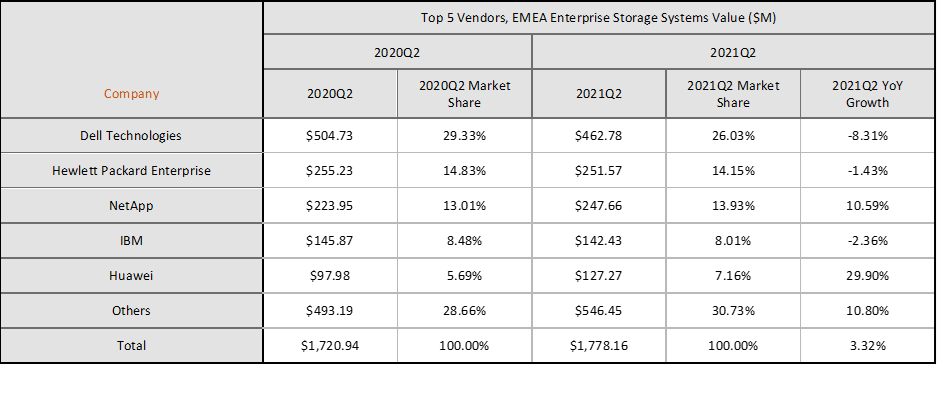 Trh s externímu úložnými systému v regionu EMEA ve druhém čtvrtletí podle IDC v tržbách (vyjádřených v USD) meziročně vzrostl o 3,3 %. V eurovém vyjádření však došlo k 5,5% meziročnímu poklesu.