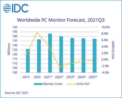 IDC podle dosavadních odhadů předpokládá, že za celý rok 2021 se prodalo přes 143 milionů monitorů, což je nejlepší výsledek od roku 2012. V letošním roce se pak počítá se stabilizací trhu a mírným meziročním poklesem (lehce přes dvě procenta).