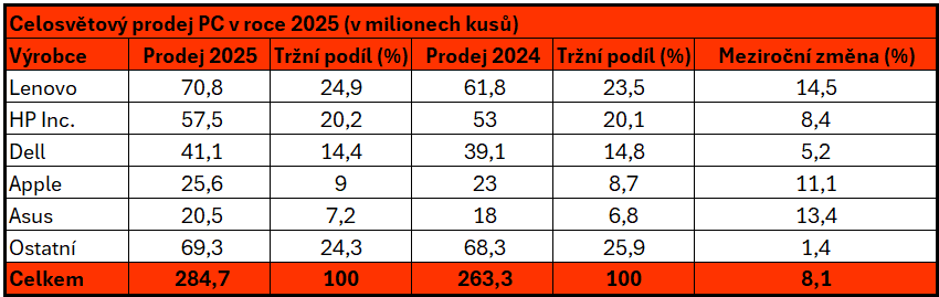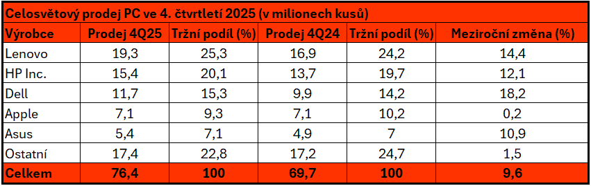 Celosvětové dodávky osobních počítačů ve čtvrtém čtvrtletí roku 2025 podle společnosti IDC meziročně vzrostly o 9,6 % na 76,4 milionu kusů. Tyto výsledky jsou vyvrcholením bouřlivého roku, který výrazně ovlivnilo ukončení podpory systému Windows 10 a s tím spojený nárůst poptávky. Začátek loňského roku byl navíc poznamenán obavami ze zavedení cel, na konci roku do dění na trhu naopak promlouvalo očekávané zdražování.
