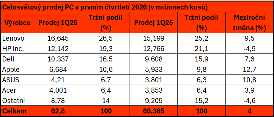 Prodej PC v prvním čtvrtletí 2026 podle Gartneru vzrostl o čtyři procenta