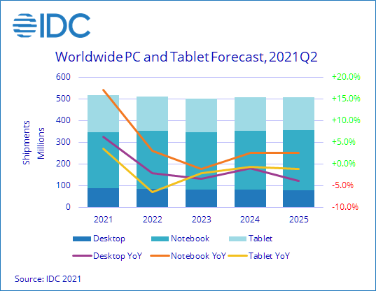 IDC předpokládá, že prodej počítačů (tedy desktopů, notebooků a pracovních stanic) v období let 2021-2025 poroste složeným ročním tempem 3,2 %. U tabletů se za stejné období očekává 1,5% pokles. Navzdory krátkodobým problémům s výrobou budou tahounem růstu PC trhu primárně notebooky.