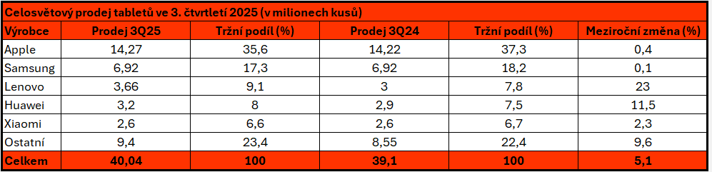 Globální trh s tablety vzrostl ve třetím čtvrtletí roku 2025 meziročně o 5,1 %, a to především díky silné poptávce v Číně a expanzi čínských producentů tabletů do regionů Středního východu a Asie a Tichomoří. Společnost Apple zaznamenala stagnující růst a navázala na své silné výsledky ze třetího čtvrtletí roku 2024 se 14,3 miliony prodaných kusů. Společnost Samsung také zaznamenala stagnaci (a prodala 6,9 milionu tabletů). Lenovo vykázalo mezi hlavními výrobci největší růst (prodalo 3,7 milionu kusů, což představuje meziroční nárůst o 23 %). Společnosti se dařilo zejména v komerční sféře regionu EMEA. Huawei následoval na čtvrtém místě se 3,2 miliony kusů a 11,5% růstem. Pětici největších výrobců uzavřelo Xiaomi, které prodalo 2,6 milionu tabletů a vykázalo meziročním nárůst o 2,3 %.