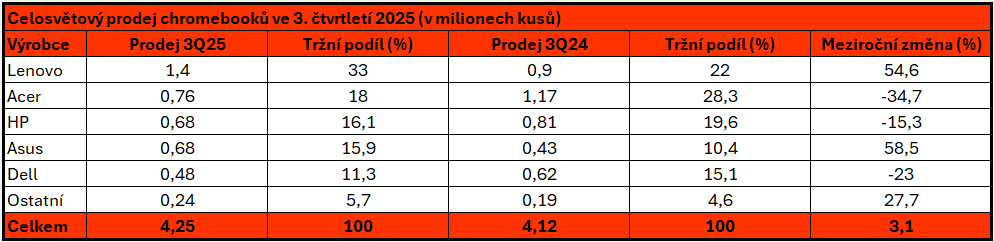 Ve třetím kvartálu roku 2025 vzrostl trh s chromebooky o 3,1 %. Segmentu dominovala společnost Lenovo, která dodala 1,4 milionu kusů (meziroční nárůst o 54,6 %). Následoval Acer s 18% podílem na trhu a globálními dodávkami dosahujícími 800 000 kusů. Třetí místo obsadila společnost HP s 0,7 milionu kusů a meziročním poklesem o 15,3 %. Společnost Asus, která stejně jako Lenovo těží z japonského projektu GIGA 2.0, si zajistila čtvrté místo s působivým meziročním růstem o 59 %. Páté místo obsadila společnost Dell.