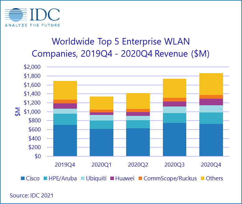 Prodej podnikových WLAN sítí podle IDC rostl nejenom v posledním loňském kvartálu (meziročně o 10,3 % na 1,86 miliardy USD), ale i v souhrnu za celý rok (o 1,9 % na 6,35 miliardy USD). Z hlediska počtu prodaných zařízení pak trh podnikových WLAN zařízení ve čtvrtém čtvrtletí loňského roku meziročně stoupl o 14 %.