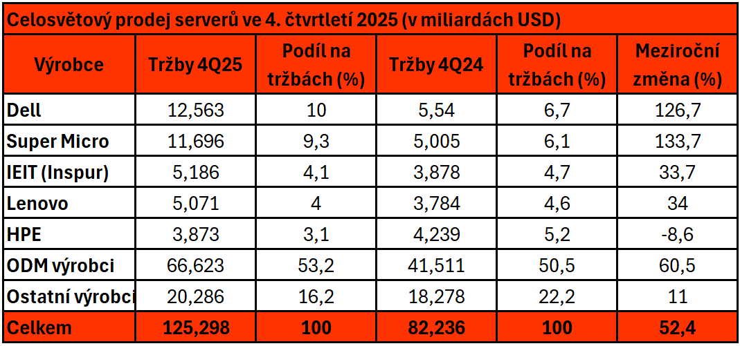 - Tržby v segmentu serverů x86 vzrostly ve 4. čtvrtletí 2025 o 16,9 % na 69,8 miliardy dolarů, zatímco tržby z prodeje serverů ostatních kategorií vzrostly meziročně o 146,4 % na 55,5 miliardy dolarů.