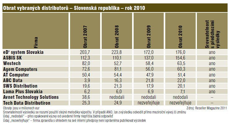 Ani slovenští distributoři nečekali zázrak a jejich odhady byly konzervativní. Ľubomír Očko, ASBIS SK: „Trh sa vyvíjal podľa našich očakávaní. Bol ovplyvnený doznievajúcou hospodáskou krízou, voľbami a na konci roku zlepšujúcou sa ekonomickou situáciou. ASBIS SK dosiahol v roku 2010 taký istý rast obratu (13%) ako rok predtým. Podľa môjho názoru v roku 2009 trh klesol o 10 percent, v roku 2010 mierne rástol. Najviac trh ovplyvnili voľby, ktoré spôsobili zastavenie, prehodnotenie, alebo odklad veľkých projektov v rámci programu OPIS (Operačný program informatizácie spoločnosti).“ Peter Remeník, Westech, člen Elko Group: „Rok 2010 sa vyvíjal podľa očakávaní, keďže plány boli dosť konzervatívne, vývoj na trhu to len potvrdil.“