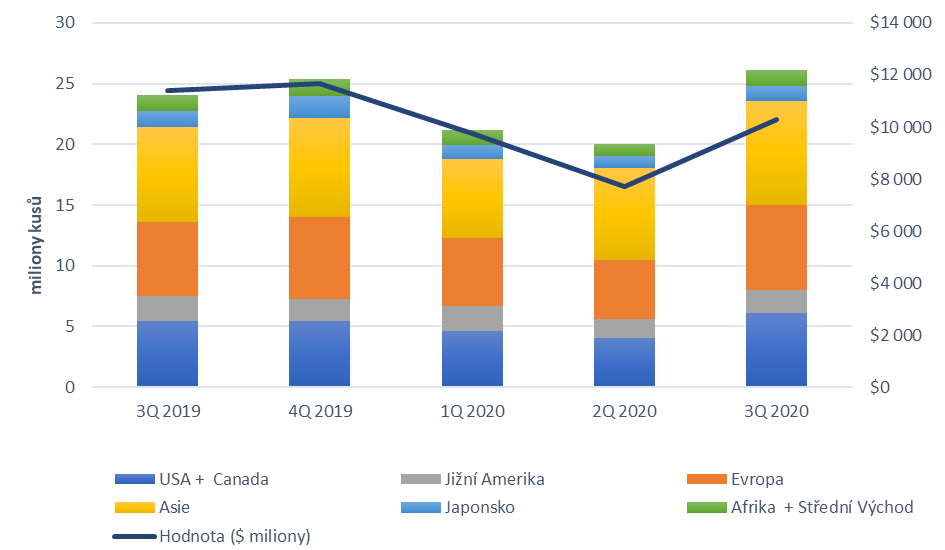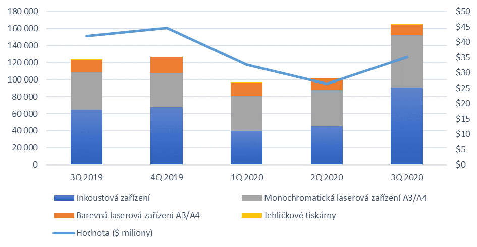 Ve třetím čtvrtletí 2020 odebral český trh přes 165 tisíc tiskových zařízení. Meziročně vzrostl odbyt o třetinu a v mezikvartálním srovnání bezmála o dvě třetiny. Nákupní aktivitu rapidně zvýšily české domácnosti, které si pořizovaly zejména cenově dostupná inkoustová multifunkční zařízení.