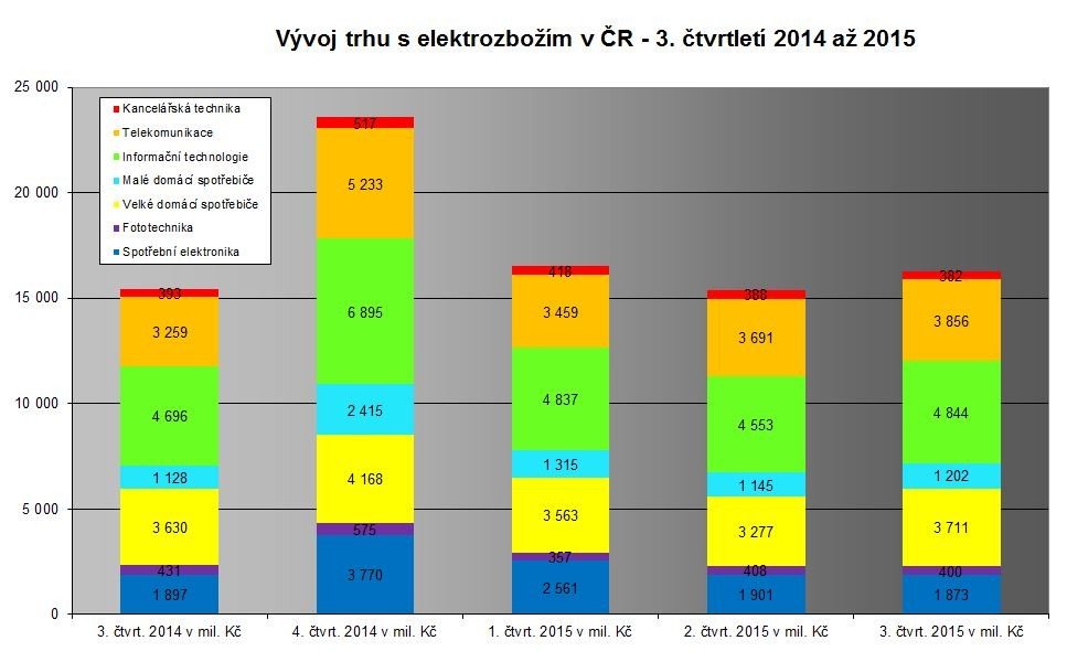 V ČR došlo k poklesu trhu u sektorů spotřební elektroniky a fota. Dynamické nárůsty generuje nadále sektor telekomunikací, mírně rostou i sektory malých a velkých domácích spotřebičů a také informačních technologií a kancelářské techniky.