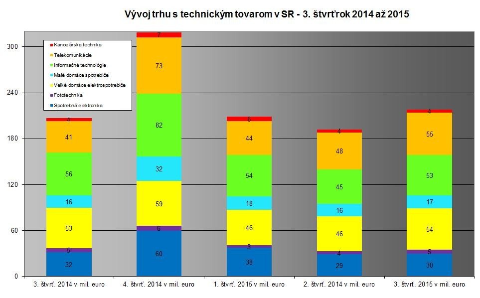 Sektor informačných technológií zaznamenal v treťom štvrťroku medziročný pokles o viac ako 5 % v hodnotovom vyjadrení. Na negatívnom vývoji sa najvýraznejšie podieľali tablety a stolné počítače. Prenosné počítače a monitory dokázali medziročne rásť, avšak neboli schopné kompenzovať stratu ostatných skupín. Nárast prenosných počítačov je stále ťahaný najmä Bing zariadeniami s veľmi nízkou predajnou cenou.