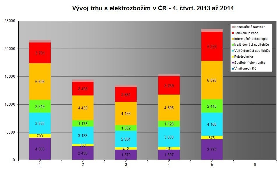 Trh spotřební elektroniky vykázal oproti stejnému období předchozího roku hodnotový pokles o 7 %. Nicméně tento vývoj byl zásadně ovlivněn zvýšenými prodeji v listopadu 2013 díky intervenci České národní banky k oslabení české měny. Mimo listopad už trh klesal jen nepatrně.