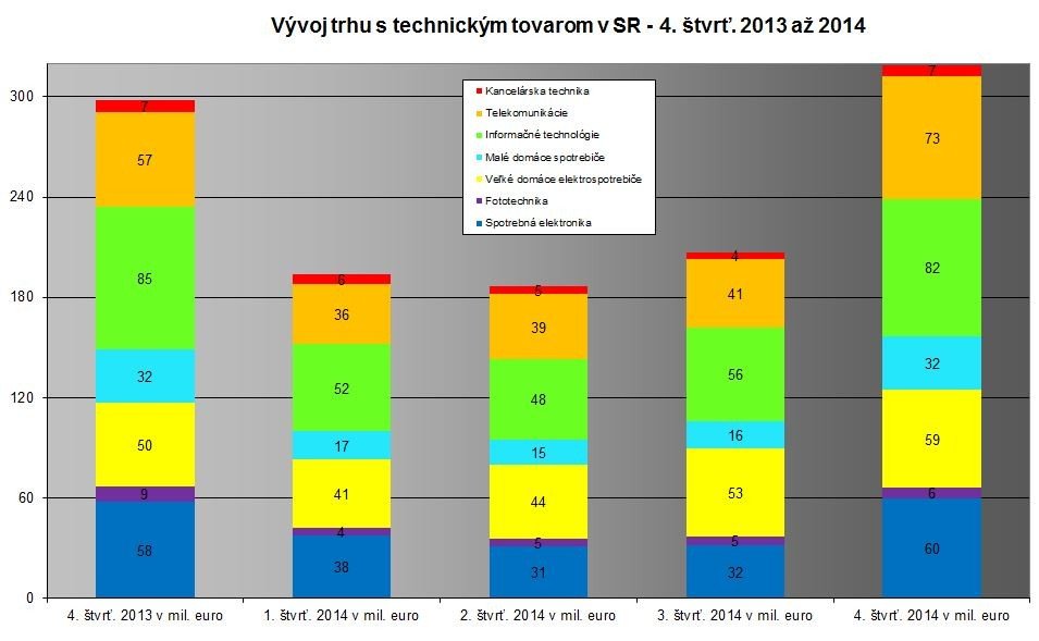 Na Slovensku v poslednom kvartáli roku 2014 skončil trh spotrebnej elektroniky v mierne negatívnych hodnotách. Objem predajov kľúčovej kategórie, televízorov, síce vzrástol, ale vzhľadom k cenovej erózii sa obrat medziročne znížil. Pokračoval presun spotrebiteľského dopytu smerom k väčším uhlopriečkam a vybavenejším modelom.