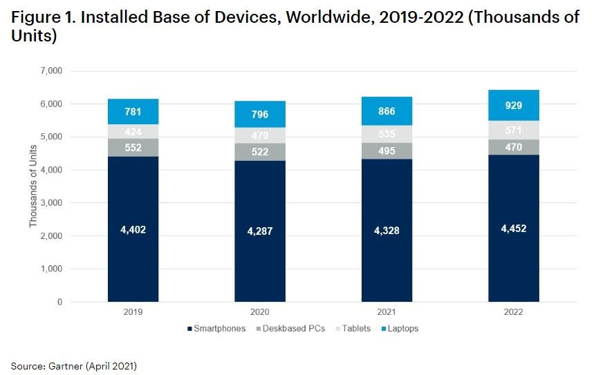 Letos se však růst počtu používaných zařízení ve světě podle Gartneru nezastaví. Již v příštím roce by mělo toto číslo vystoupat na 6,4 miliardy (meziroční nárůst o 3,2 %). Zatímco přesun pracovníků na modely vzdálené práce zpomalí nárůst prodeje stolních počítačů, přinese další růst prodeje notebooků a tabletů. V roce 2021 Gartner predikuje nárůst počtu používaných notebooků o 8,8 a tabletů o 11,7 %. V případě provozovaných desktopů by pak mělo množství zařízení klesnout z 522 milionů v roce 2020 na 470 milionů v roce 2022.