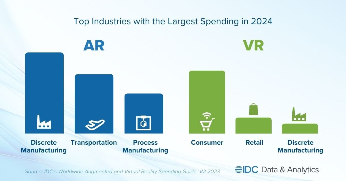 V roce 2024 budou za rozšířenou realitu nejvíce utrácet odvětví diskrétní (kusové) výroby, dopravy a průmyslu. Výrobně zaměřená průmyslová odvětví budou AR využívat pro údržbu majetku, vzdálenou komunikaci nebo školení. Tím, že AR umožňuje zefektivnit i ty nejsložitější úkoly v reálném čase, přispívá k optimalizaci procesů v celém hodnotovém řetězci. V oblasti B2B budou v příštím roce nejrychleji růst výdaje na AR v sektoru ústřední státní správy, a to díky nasazení řešení AR v projektech chytrých měst. Rozšířená údržba je nejoblíbenějším případem použití AR, ale díky rostoucí poptávce po hrách AR ve spotřebitelském segmentu bude toto využití AR do roku 2027 nejrychleji rostoucí.