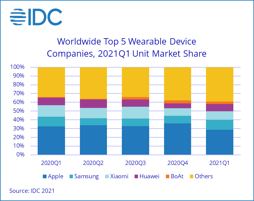 Ačkoli výsledky nebyly podle IDC tak dobré jako v posledním loňském čtvrtletí, z meziročního srovnání vycházejí více než dobře. Celkem se v prvním čtvrtletí 2021 prodalo 104,6 milionu nositelných zařízení, což představuje meziroční nárůst o 34,4 %.