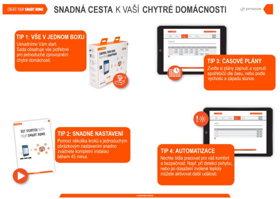 Produkty Proove jsou stavebnicovým řešením pro řízení a automatizaci, která přináší uživatelům vyšší komfort ovládání i vyšší bezpečnost. Systém se zaměřuje na komfortní ovládání a jednoduchost instalace. Z telefonu, tabletu, nebo počítače tak lze ovládat topení, osvětlení a další spotřebiče. Dále lze sledovat vnitřní i vnější teplotu nebo třeba teplotu bazénu či lednice.