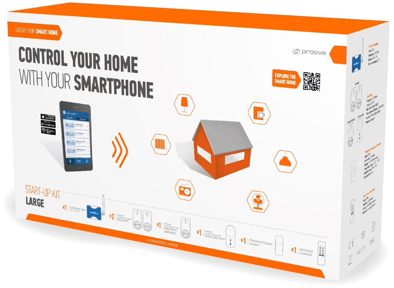 Startovací set SmartHome Kit Large obsahuje modul Tellstick Net, dvě ovládané zásuvky, jednu ovládanou zásuvku se stmívačem, jednu venkovní ovládanou zásuvka a sensor pro měření teploty a vlhkosti. Doporučená koncová cena je 3 480 Kč bez DPH.