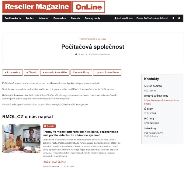 - Na profilové kartě se agreguje obsah související s danou společností i další informace (představení firmy, kontakty nebo odkazy na partnerské programy a další weby).