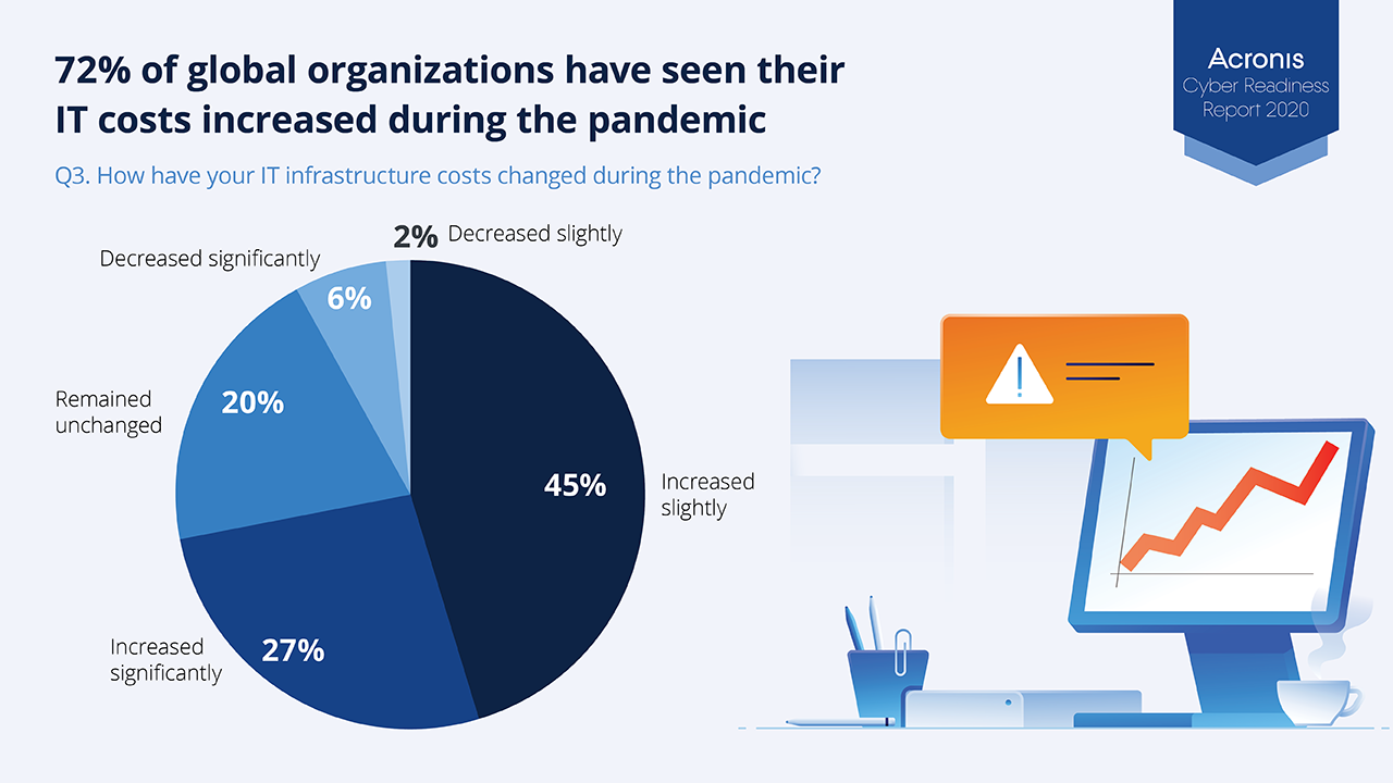 - Malwarové útoky typu ransomwaru rovněž vzrostly, když 31 % společností ohlásilo každodenní útoky a polovina (50 %) pocítila takový útok alespoň jednou týdně. V červenci například došlo k tomu, že přední poskytovatel GPS technologií zaplatil 10 milionů dolarů po ranomwarovém útoku WastedLocker. Operační centraAcronis Cyber Protection zjistila, že 35 % koncových zařízení zákazníků bylo vystaveno malwarovým útokům, které probíhaly až do okamžiku nasazení řešení Acronis Cyber Protect.