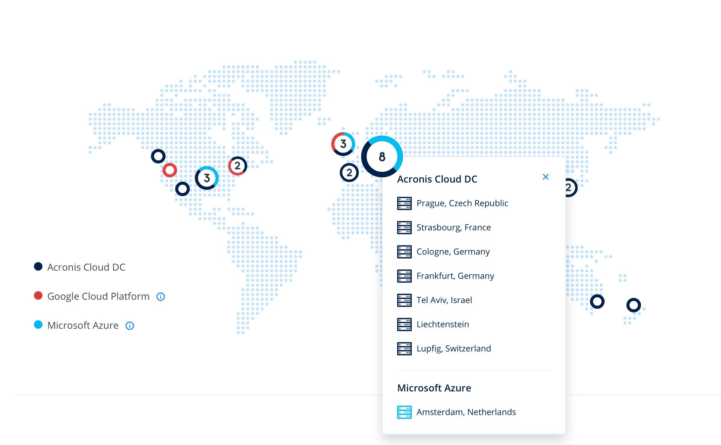 Globální síť datových center Acronis již zahrnuje centra v USA, Velké Británii, Švýcarsku, Lichtenštejnsku, Francii, Německu, Španělsku, Izraeli, Japonsku, Austrálii, Kanadě a Singapuru. S novým datovým centrem v Praze mají lokální poskytovatelé služeb k dispozici úložiště, kam mohou ukládat kritická data svých klientů. MSP mohou rovněž využít přínos kompletní sady řízených cloudových služeb a řešení kybernetické ochrany dostupné v rámci platformy Acronis Cyber Cloud.