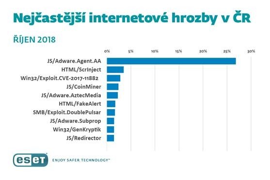 Nebezpečí, že si čeští uživatelé do internetového prohlížeče stáhnou škodlivý doplněk kvůli činnosti hrozby JS/Adware.Agent.AA opět stouplo. Během října tento škodlivý kód stál za každou čtvrtou internetovou hrozbou, kterou zachytil bezpečnostní software společnosti ESET. Konkrétně šlo o 26,83 % případů ze všech zachycených internetových útoků, což oproti září představuje nárůst o více než čtyři procentní body.