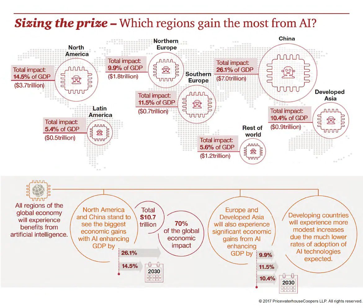 PwC očekává, že nejvýznamněji bude zavádění umělé inteligence ovlivňovat HDP v Číně a v severní Americe. V Číně může HDP vzrůst dokonce o 26 %, společně se severní Amerikou tak budou tyto dva regiony zodpovědné za 70 % ekonomických přínosů AI. „Ze správného zavádění AI budou profitovat všechny regiony světa. Nicméně země, které do umělé inteligence a digitalizace již investovaly, mají již nyní značný náskok, proto budou benefity v rozvinutějších regionech větší. Zavádění AI je na druhou stranu obrovskou příležitostí i pro méně rozvinuté regiony. Nové start-upy pracující s AI nebo firmy, které ještě ani nevznikly, mohou být za 10 let tržními leadry,“ dodal Ložek.